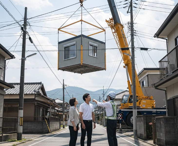 また、現場ではクレーン車を使ってユニットを吊り上げる作業スペースも必要になります。
