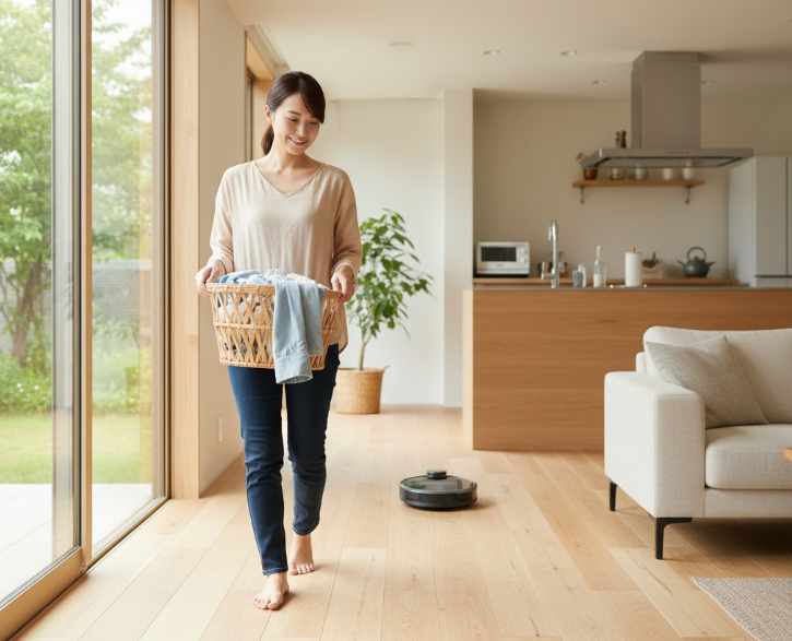 朝起きて、寝室からリビングへ移動し、朝食をとり、洗濯をして、掃除機をかける。