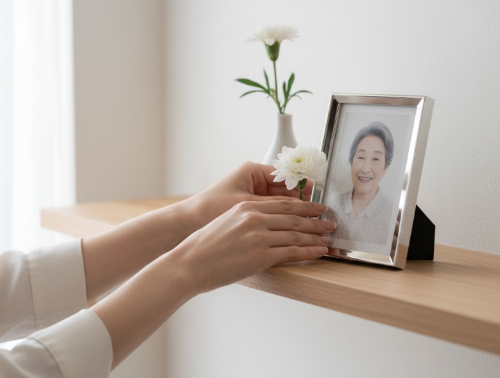 例えば、リビングの飾り棚や寝室のチェストの上に、お気に入りのフォトフレームに入れた故人の写真を飾り、その隣に季節の花や故人が好きだったお菓子、飲み物などを供えるのです。