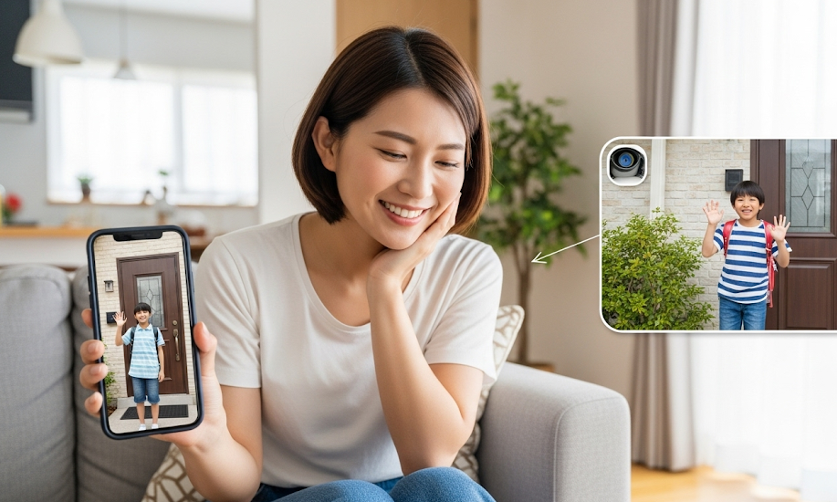 - お子様の帰宅確認: 玄関に向けて設置したカメラで、お子様が学校から無事に帰宅したことを外出先のスマホから確認できます。通話機能付きのカメラなら、「おかえり」と声をかけてあげることも可能です。