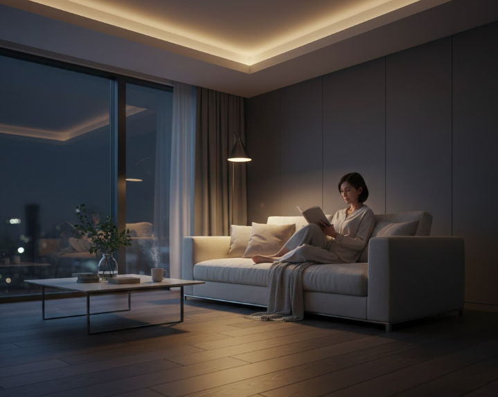 グレーウォールナットを選ぶなら、ダウンライトや間接照明のプランもセットで「暖色系」にすることを強くおすすめします。
