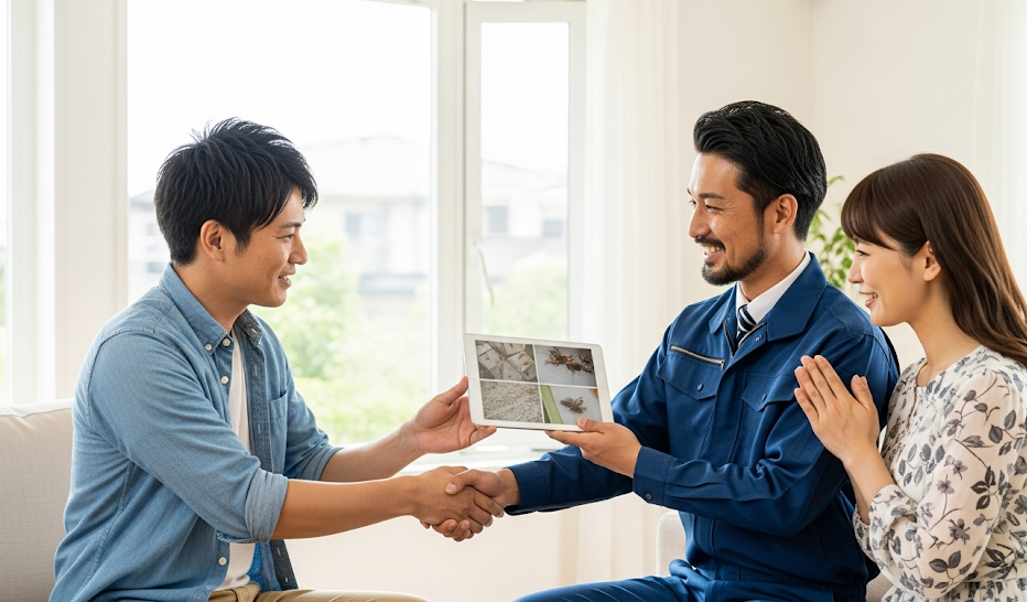 - 充実した保証とアフターフォロー:施工後の保証内容は非常に重要です。一般的には5年間の保証が付帯し、期間内にシロアリが再発した場合は無料で再施工を行うという内容が基本です。保証書を正式に発行してくれるか、保証内容に不明瞭な点はないか、しっかりと確認しましょう。