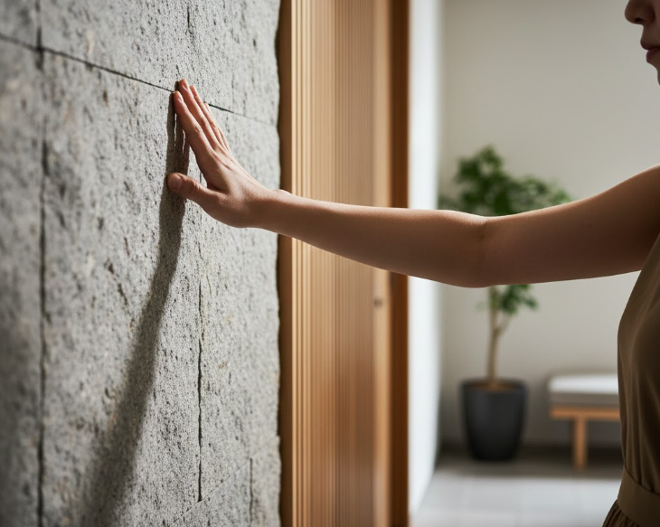 例えば、滑らかな塗装壁の前に、ザラザラとした質感の石材を配置するだけで、空間の密度は一気に高まります。