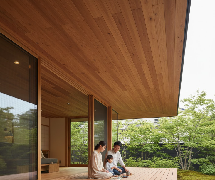 さらに、軒裏(屋根の裏側)の素材を、室内の天井材と色味や質感を合わせることで、視線が自然と外へと抜け、実際の畳数以上に部屋を広く見せる効果もあります。