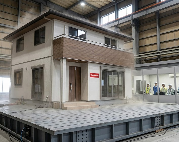タマホームは、実際の家を巨大な揺らし台に乗せて実験する「実大振動実験」を公開しています。